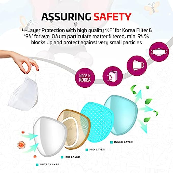 • ✅ BEST KIDS PROTECTION – This Extra Small KF94 disposable face mask is made with high quality MB fabric that is effective. Made with a triple-layered electrostatic filtration system, this product will filter at least 94% of PM2.5 to protect the wearer from exposure to harmful dust. This children's mask is very effective in protecting from dust, air pollution, and more. Protect your children’s health with these disposable face masks for kids.