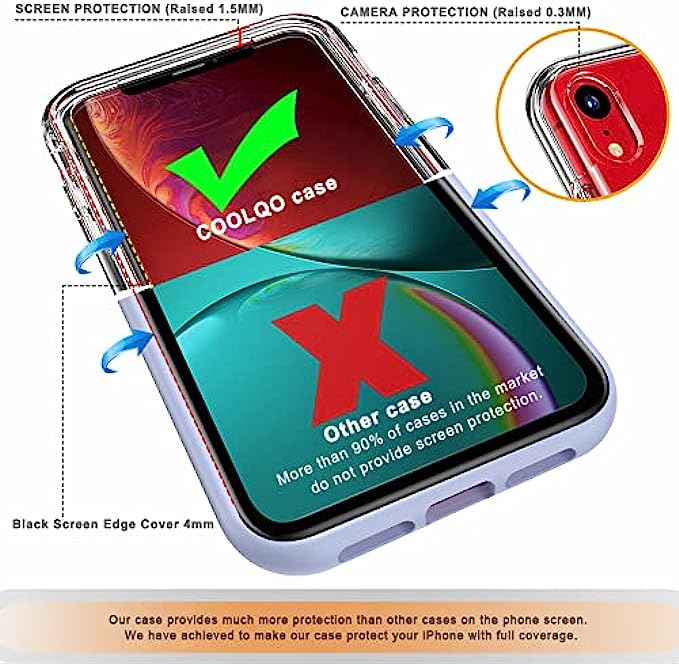 Military Grade Protection: 3in1 dual-layer case provides 360 degree full body coverage protection. Premium hybrid hard Polycarbonate (PC) + soft Thermoplastic Polyurethane (TPU/Silicone) + Tempered Glass Screen Protector. Meeting Military Standard MIL-STD-810G & Well protecting your phone against up to 3m (10 feet) high drops. Camera & Screen Protection: 0.3mm raised lip protects your camera, 1.5mm raised lip relieves impact and protects your iPhone screen against drops & cracks & surface scratches. Long Lasting Clear: All COOLQO PC & TPU raw materials come from Germany, Super anti-yellowing materials provide long-lasting clarity to show original beauty of your iPhone. Screen Protector: COOLQO offers TWO Tempered Glass Screen Protector, Arc edge design features an oleophobic coating that resists oils, preventing undesired fingerprints that can interfere with using the device, Bubble-free during application, Easy to install and remove. Compatible with: iPhone XR (2018) 6.1 Inch, we provide 90 days warranty. If you have any question, please contact us, we will fix your issue within 24 hours. (NOTE: If you are looking for the same case of iPhone other models, you can also find it in our store).