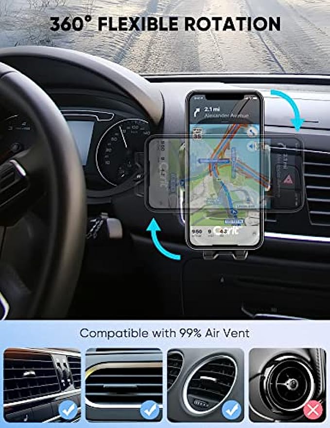 • ?Upgraded Steel Hook - The metal phone mount for car vent clip is 70% longer and sturdier than other air vent clips, compatible with 98% of horizontal and vertical air vent blades, as well as solving the problem of the hook being easily broken. Note: The car phone holder mount vent clip are not suitable for round air vents.