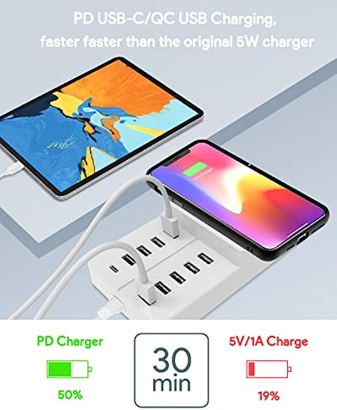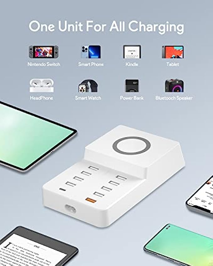 Smart Fast Charging - Charging Station Manager contains 8 12W USB ports, 1 20WPD port and 1 20WQC port and 1 10W wireless charging. The adaptive smart chip detects and provides the optimal charging current to the connected device to reduce charging time.