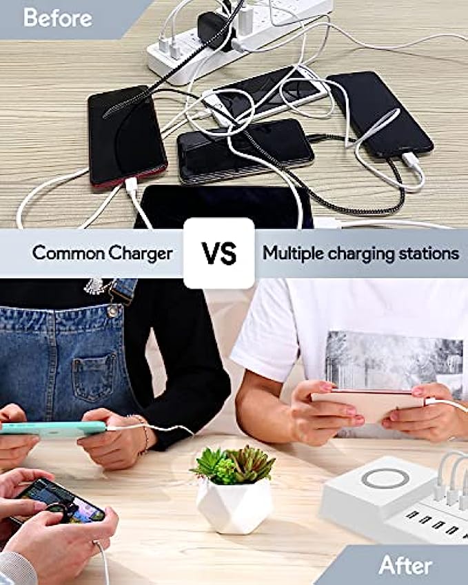 Neat and organized - The phone charging station can charge up to 11 devices in one place at the same time, eliminating the need to plug countless chargers into power sockets or spread devices across the desk, keeping your desk clean and clutter free from cluttered cables.