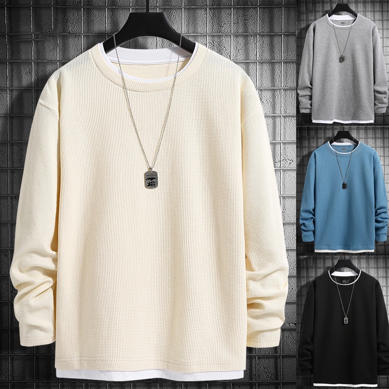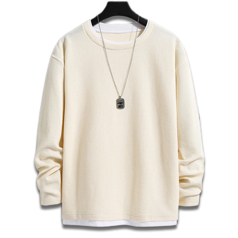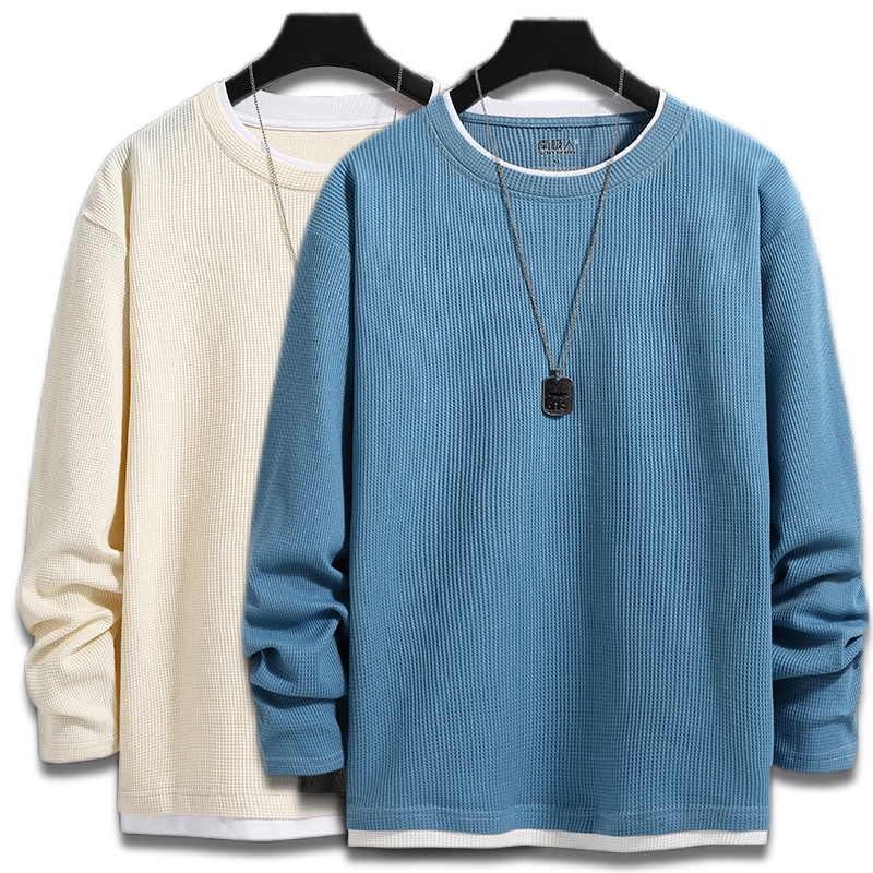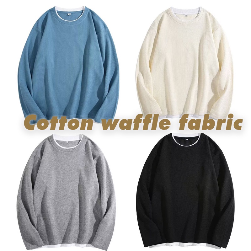 Cotton Long Sleeve Waffle Sweatshirt Men Round Neck Oversize Sweater Basic Model Fake Two-Piece Knit Long Sleeve Tshirt