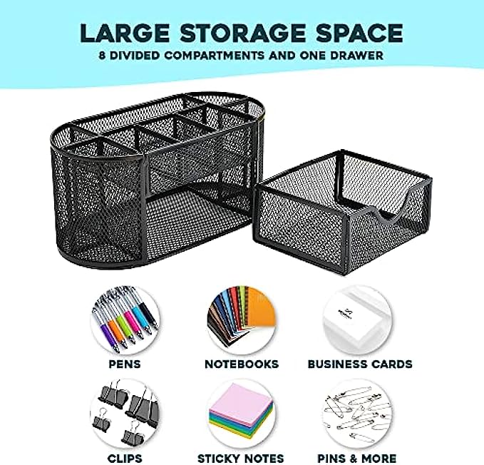 Desk Organizer 8 Compartment Black Mesh Multi Function-Caddy With Drawer For Work And Office Supplies. Organizers For Accessories, 8.85x4.3x4.7 Inches