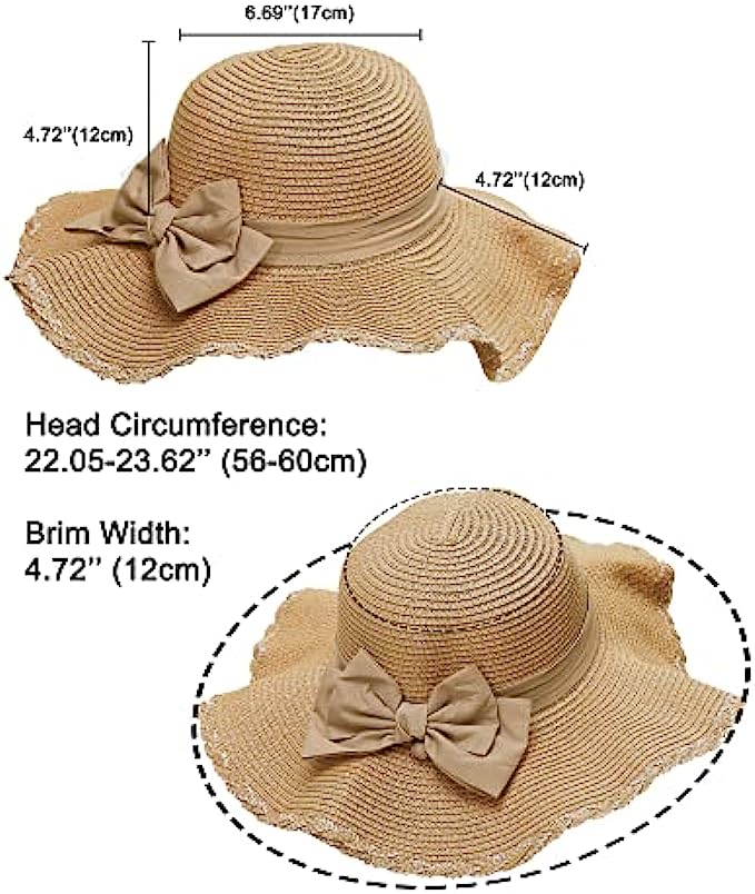 Straw Imported Elastic closure Hand Wash Only [ONE SIZE FITS MOST] Style 1 : brim 3.15’’ (8cm), height 4.33’’ (11cm), circumference 21.26-22.83’’ (54-58cm). Style 2: brim 4.72’’ (12cm), circumference 22.05-23.62’’ (56-60cm). One size fits most women, girls and ladies. There is a elastic string that makes it size up better [DURABLE STRAW FABRIC] Double woven straw hat is durable and not easily lose shape. It can block harmful UV rays in order to prevent skin sunburn. Lightweight and breathable, keep your head cool all day [WIDE BRIM & BOW TIE] Floppy brim makes you more charming and adorable. Soft linen bow tie makes the beach hat feature personal and fashion. Bringing you shade and beauty in the hot and boring summer