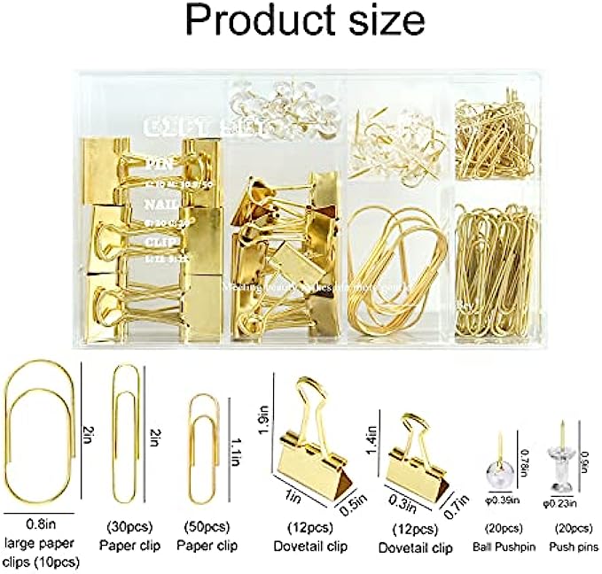 PACKAGE INCLUDES - 10 pcs jumbo paper clips (0.8" x 2"), 30 pcs large 2" paper clips, 50 pcs small 1.1" paper clips; 12 pcs small 1" binder clips, 12 pcs mini 0.3" binder clips; 40 pcs clear push pins, 154 pcs in total. Assorted sizes and variety items meets your different using needs.