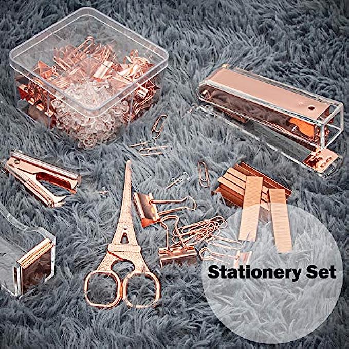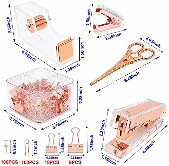 • 【Package includes】:1xStapler,1xTape Dispenser,1xStaple Remover,1xScissors,26pcs Binder Clips,100pcs Paper Clips,100pcs Push Pins and 1000pcs staples(all Rosegold)