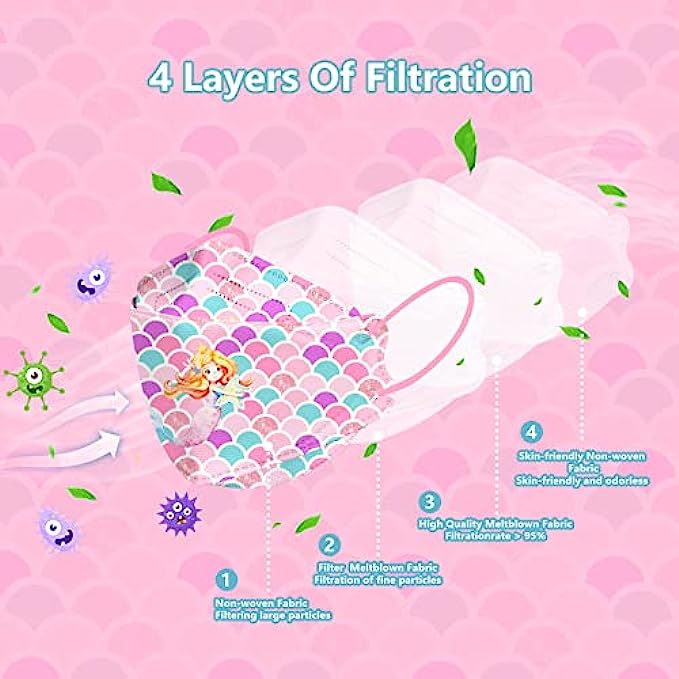 • 【4-layer Filtration】-This 4-layer filter mask consists of two layers of non-woven fabric inside and outside and two layers of meltblown fabric in the middle, with a willow leaf design that covers the child's nose, mouth and chin, non-irritating, soft and comfortable.