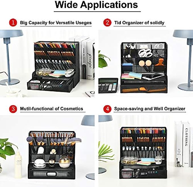 ✏️【VERSATILE DESIGN】: This Desk Caddy is not only perfect for storing your desktop stationery such as pen, pencil, markers, ruler, eraser, paper clip, scissors, letter openers and and many other desk widgets but also great for storing your makeup brushes, nail polishes, lipsticks and other small personal items sorted by type, which makes it way easier to find what you need! and You can put any other daily necessities on the organizer,It helps you keep your stuff organized.