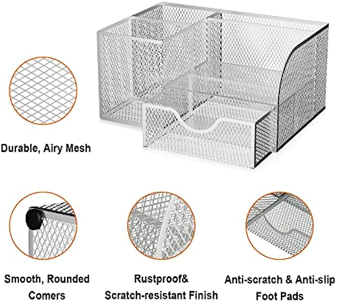 • 【STYLISH MESH DESK ORGANIZER DESIGN】We use superior modern technology to make the construction of office supplies desk organizers much sturdier and more durable. The reliable, high-quality metal mesh design looks more elegant than other mesh or plastic office supplies organizers. There are four non-slip pads on the bottom of the office organizer to protect your desk from scratches