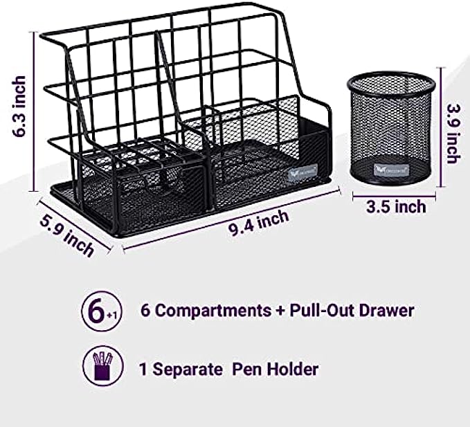 ? No assembly required with this office decor! Just fill with all your stationery and enjoy stationary organizer for desk! It’s 47% bigger than our largest rival, but still compact for your desk - with 6+1 space for tape, erasers and phone, a drawer for paper clips, staples and pins, 2 slots for pens, pencils, rulers or scissors, a pen cup, letter tray for files, diary and laptops, and 3.34” square for standard 3” post-its.