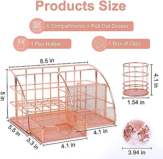 • START YOUR ORGANIZER JOURNEY RIGHT AWAY:This stylish and modern rose gold desktop organizer features 6 compartments and 1 mini pull-out drawer. There are also come with a pen holder and a box of paper clips. Meet all your needs when organizing your desktop. Let's start to make changes and to be more creative all day!