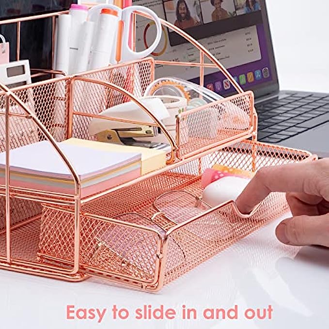 UPGRADED DESIGN: After market research, we optimized the design of the pen holder. First, the pen holder is redesigned so that the pen doesn't slip out. Second, our desk organizer pull-out drawers slide in and out smoothly and easily when pulled out without jamming. Thirdly, after the rose gold increases the size, the A4 folder can be easily placed on the back. Finally, the desk organizer is fully assembled and just needs to be unboxed.