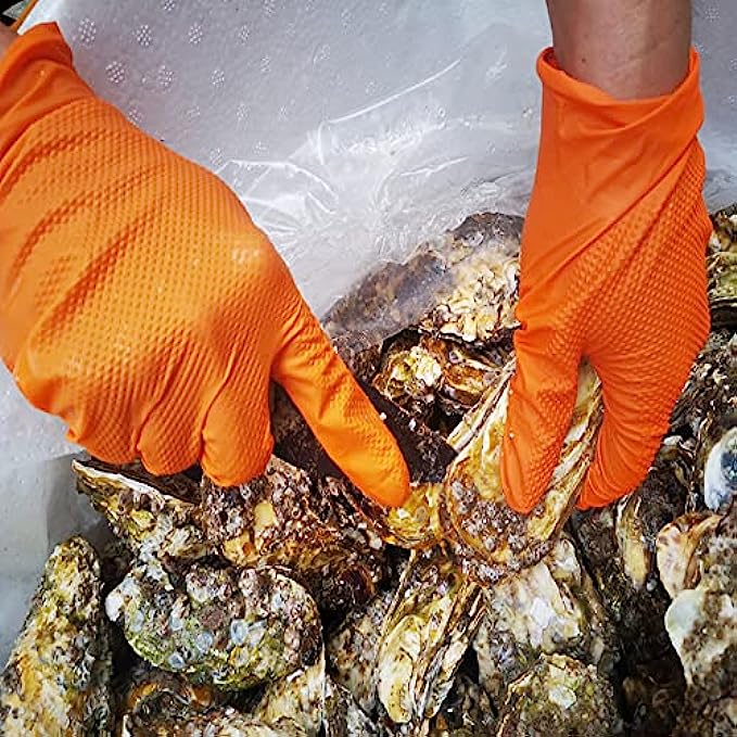 Imported Elastic closure HEAVY DUTY: TitanFlex 8-mil premium nitrile gloves are 2-3 times thicker than typical disposable nitrile gloves, and provide more puncture resistance and excellent barrier protection against grease, gasoline, and many other petroleum-based chemicals. THOR GRIP DIAMOND TEXTURE: Fully textured fingers and palms with arrayed raised diamond patterns provide 60% more gripping power than standard nitrile gloves, but yet have good dexterity for handling small objects and tools even wet or slippery. HIGHLY VISIBLE: The bold orange color makes the nitrile gloves and your hand easily recognizable and alerting even in darker environments, greatly improving safety in heavy-duty tasks such as mechanic, automotive, construction, and manufacturing. LATEX-FREE GLOVES: Free of natural rubber latex, these disposable nitrile gloves help reduce allergic skin reactions to latex and protein; they are elastic, stretchy, and have a snug fit, but provide more chemical resistance than latex gloves. MULTIPURPOSE: Our disposable industrial-grade nitrile gloves can be used for various industrial, commercial, and household applications such as mechanics, auto repair, janitorial, painting, plumbing, oil changes, manufacturing, & household cleaning.