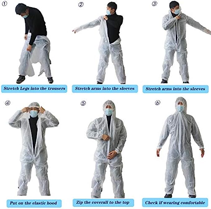 • 【PROTECTIVE OVERALL SUIT】Front zipper closure, easier donning and doffing, Elastic cuffs,waist,ankles add the secure seal protection you need ensure a snug fit. Attached hood with elastic around face opening, designed to cover neck and chin and fit around face mask, keep tight seal from pesticides or paint