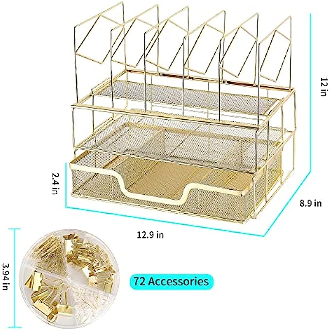 【Perfect Desk Organizer】Use a flat tray to store notebooks, scissors, and staplers; Pull-out drawers provide useful space for small items, ideal for storing small accessories such as glue sticks, paper clips, rubber bands and sticky notes. 5 file sorters + 1 extra binder clips: keep letters, magazines, bills, documents organized and and within reach.