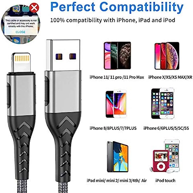 √【MFi Certified DURABLE DESIGN】: MFi Certified and built with iPhone's upgarded terminal(Super durable) and smart chipset promise no warning message pops up. Reinforced charger cable with strong SR joint design that have passed 25000+ times bending tests for extra protection and durability.Upgraded 3D aluminum connector and exclusive laser welding technology build the ightning cable more sturdy.