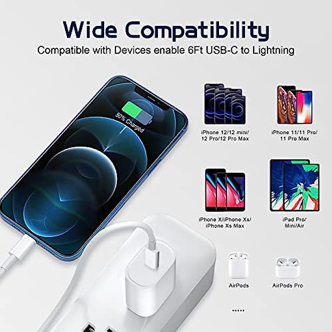 • PD 3.0 Fast Charging : PD 3.0 20W USB-C charger with 6ft type c to lightning cord, charges iPhone 12 up to 50% in just 30 minutes, which saves more than 1 hour for you, when compared to the 5W original charger.