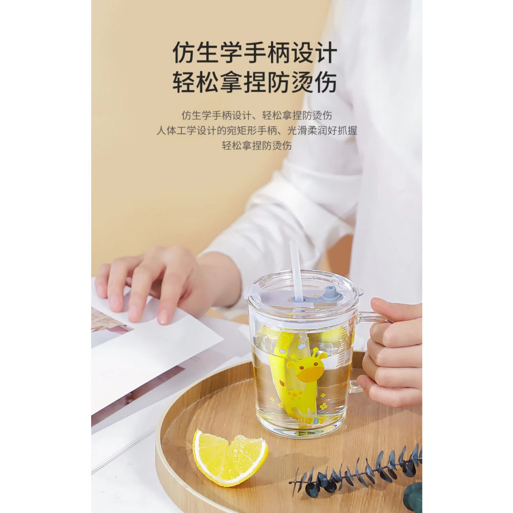 Got the Doraemon design fm seller's random despatch. Really love it. There's a straw that comes with the cup. Cos it's a glass cup, it can hold hot drinks as well. There are markings on the side so you can tell how much water/liquids your child has consumed. Overall happy with purchase.