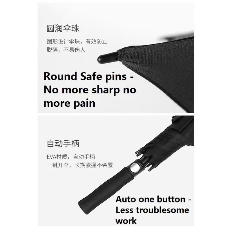 I like automatic. Nice small, colorful orange, thick UV umbrella. Length 28.5cm folded. Umbrella coverage diameter about 95cm. The Inverted umbrella is good for driver. length 34cm folded. Umbrella coverage diameter about 105cm.