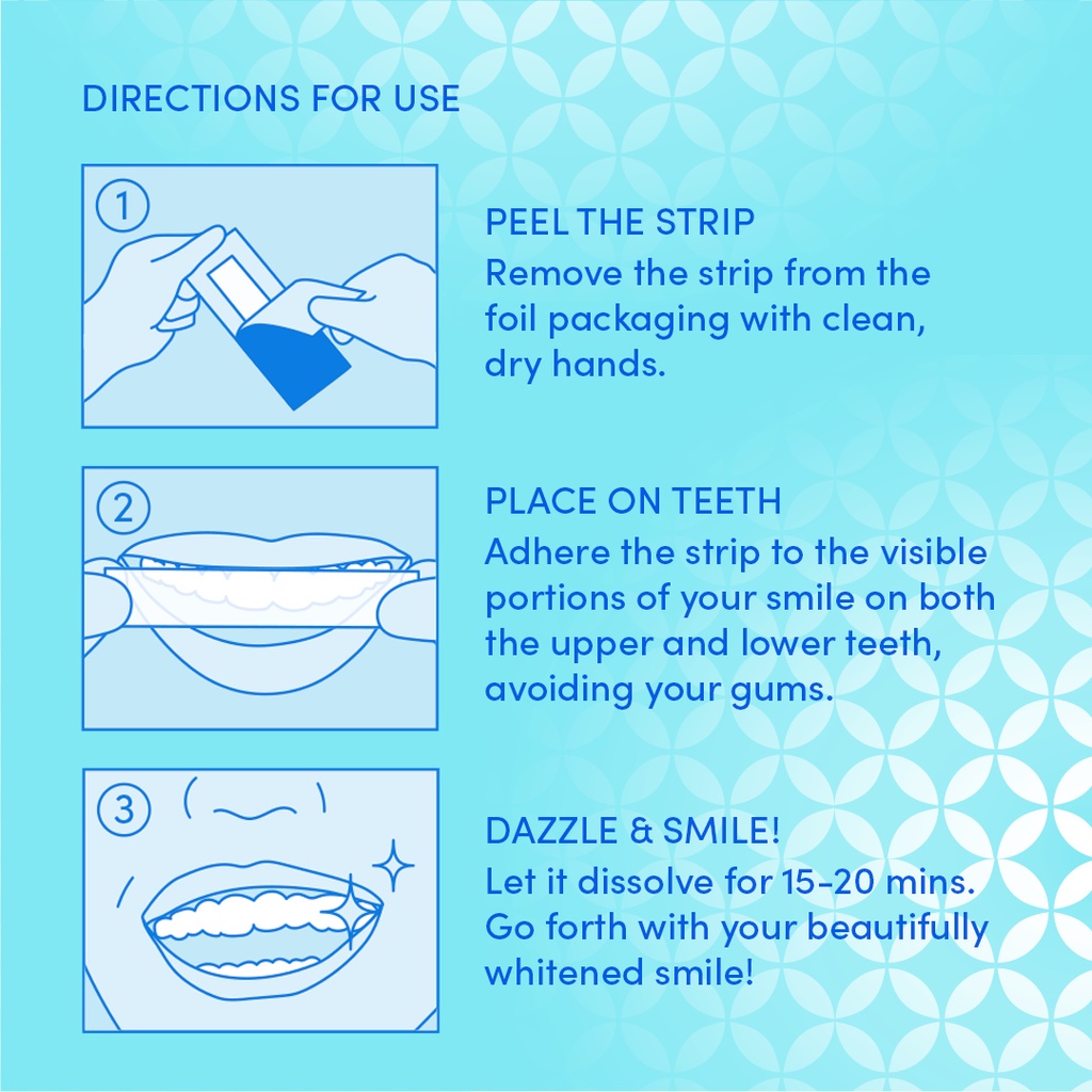 14 strips for 7 days treatment to both upper and lower teeth. The strips are not that long and would only cover the front 6 teeth at most. Best to apply them with dry fingers. However they are sticky when wet and would tear easily. They also stick to the back of lips. Leaves a minty and refreshing taste/scent. Dissolves on teeth after about 20mins. Hope will see some whitening!
